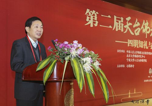 中国人民大学佛教与宗教理论研究所执行所长张风雷教授在致辞中说,天台宗由隋代智者大师创立,是中国汉地佛教最早创立的一个宗派,对隋唐以后成立的各宗派多有影响,在佛教的中国化进程中占有非常重要的地位。天台宗的影响不仅在中国佛教、哲学、思想文化等领域,而且远播至日本、朝鲜半岛等东亚地区的佛教界。浙东是弘扬天台宗的重要地区之一,四明知礼在宋初复兴天台宗的中心人物,此次研讨会主题以知礼大师的天台思想而展开,具有特殊纪念意义,研讨会取天台专宗进行深入研究,此议题在国内佛教学术研讨会中并不多见,希望七塔禅寺发挥好这个交流平台,继续将研讨会成功举办下去。
