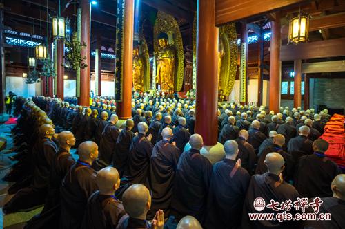 2016年11月7日上午8时许,七塔禅寺传授护国兴圣三坛大戒法会举行二坛请戒仪式,报恩大讲堂内清净庄严,众新戒威仪具足,依次排班迎请得戒和尚诚信法师、羯磨阿阇黎可祥法师(代)、教授阿阇黎监院界义法师(代)登堂说法,众新戒合掌跪拜,至诚聆听。
