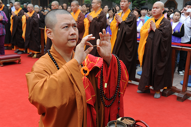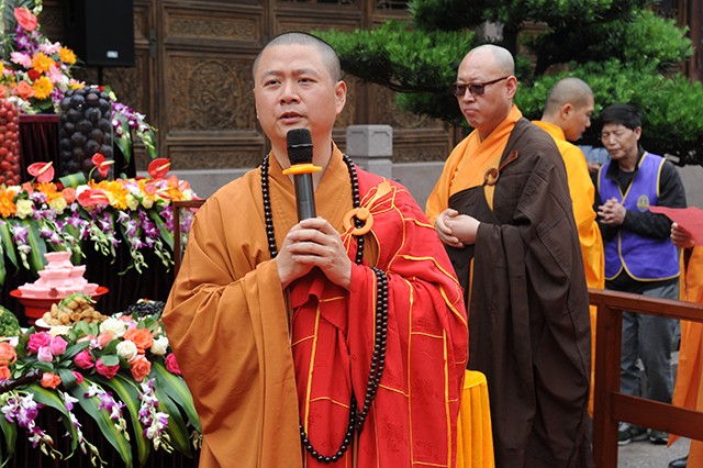浴佛法会在七塔禅寺圆通宝殿前广场隆重举行。寺院住持可祥法师主法,在佛前宣读了祈祷正法久住、国泰民安的《祈愿文》,并为大众现场开示了浴佛的内涵,以及在生活中如何实践佛法,即勤修戒定慧,息灭贪嗔痴,福慧双修,圆成佛果。七塔常住四众弟子、义工、甬城信众及香客、游人等近500人参加了这场灌沐佛身、清净自心的庄严盛会。
