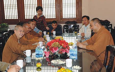 因普门柱安装工程开工在即,各项准备工作紧锣密鼓地进行。鉴于上海静安寺已成功矗立起“正法久住”梵幢,可祥法师特意向慧明法师索请了其安装过程图像资料,此次又与相关人士专程前往实地考察,并为西北角工程建设收集资料。近中午时到达沪市,在圆明讲堂智明法师处用午餐,慧明法师与定慈法师特意前来作陪。餐后一同前往静安古刹,观礼了新树梵幢石柱,参观了改建后的殿堂、基座、廊房,以及建设中的宝塔工地,听取了慧明法师的详细介绍。为落实部分细节问题,可祥法师特请慧明法师招来相关技术人员,当面进行了询问解答,获得了比较详实的资料。