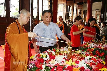 5月24日(农历四月初八)上午,甬城四众弟子及来寺参访的澳门信众等共约300人欢聚七塔禅寺圆通宝殿,隆重举行纪念佛陀诞辰2630周年大型浴佛法会。本寺方丈可祥大和尚随机为大众作了精彩开示。