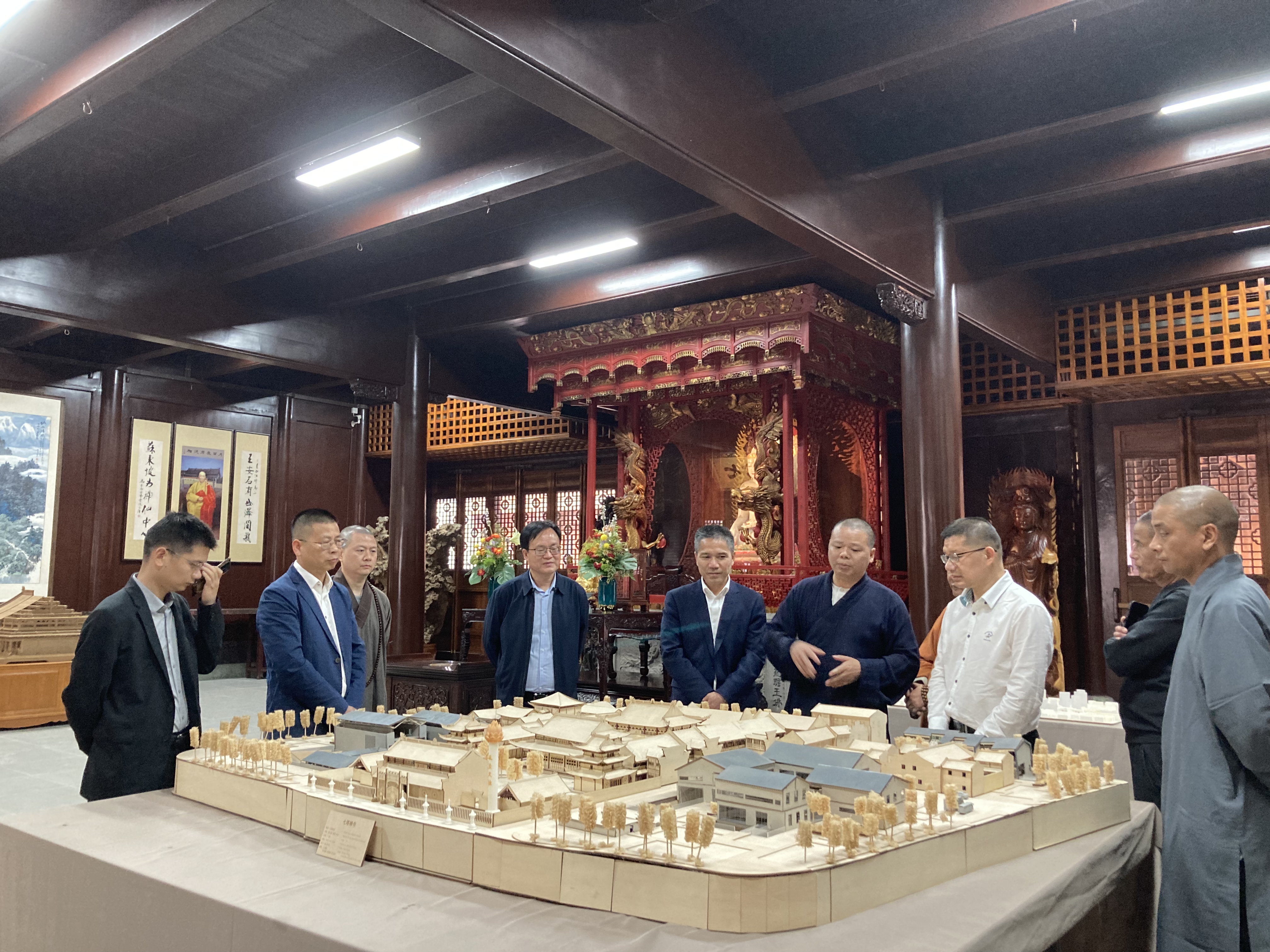可祥法师陪同李部长一行沿中轴线参观寺院的主体建筑,监院定光法师依次介绍了镶嵌于圆通宝殿、三圣殿外围的楹联匾额,殿堂内设的智能节能照明设备及寺院的日常消防安全管理。定光法师特别称赞余姚的造像艺术水平高超、极具地方特色,殿内供奉的文殊、普贤等菩萨造像均出自余姚工匠之手。参观法堂时,定光法师向参访团展示了寺院正在施工的“三馆三园”项目模型,并详细介绍了项目的建设规划和功能设计。李昭部长亲切地询问“三馆三园”项目的具体审批、施工等情况,定光法师一一作答。