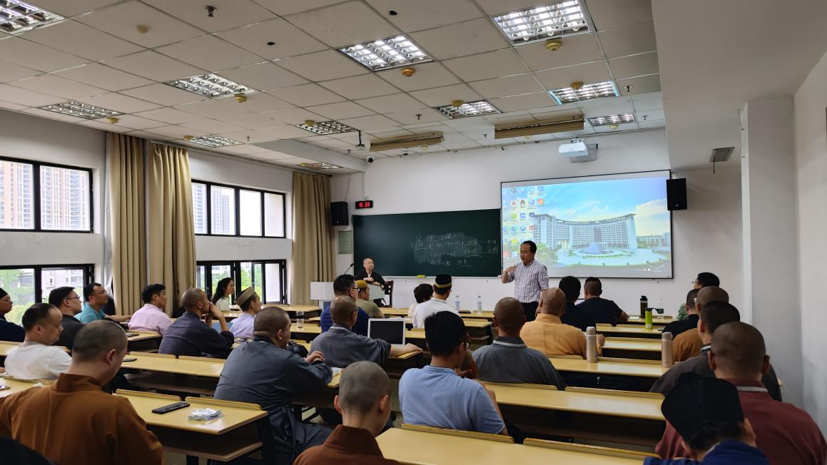 2023年5月18日下午,浙江省佛教协会副会长、七塔禅寺住持可祥法师在浙江工商大学教学楼作“文化自信背景下的寺院建设”专题讲座,这是浙江省宗教界“双通人才”研修班课程中系列讲座之一,研修班学员全体参与,讲座现场座无虚席。