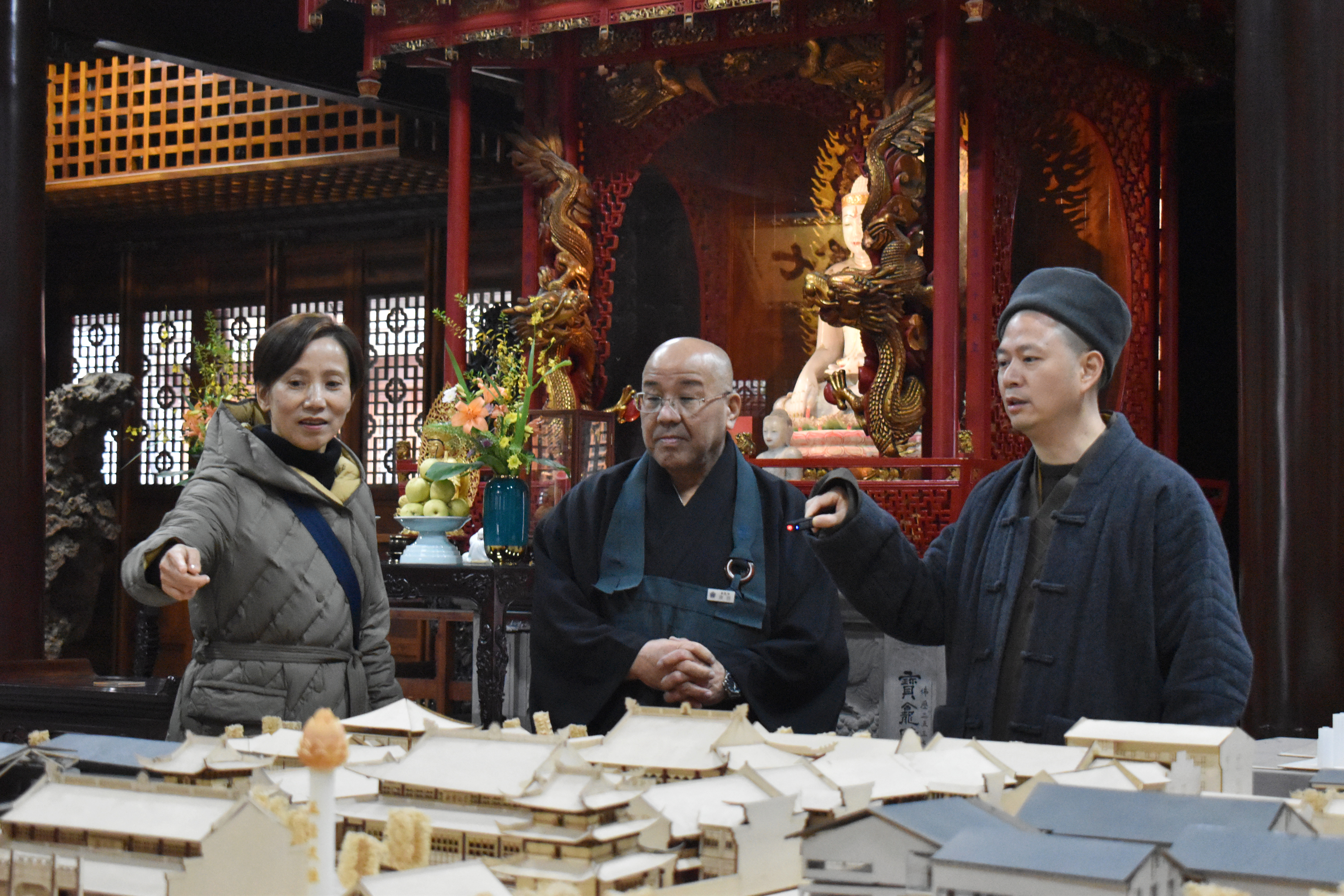 双方会面后,七塔禅寺住持可祥法师热情问候了原田长老近况,随后陪同长老一行入殿敬香礼佛。在文物室,可祥法师特别介绍了早前原田长老赠送的日本曹洞宗前贯首秦慧玉、福山谛法的书法作品。参观法堂时,可祥法师介绍了寺院“两馆三园”项目的建设规划及工程进展,并以圆瑛大师书作:“道德为立身根本,文章是济世经纶”一联为引,为原田长老一行详细梳理了七塔禅寺中兴之祖慈运长老,与得法弟子圆瑛大师、再传弟子明旸法师的师承法缘;并一一展示了继远堂门口镶嵌的“策彦周良”纪念铜牌和寺院计划镶嵌于圆通宝殿内的“千手千眼”石刻观音像。