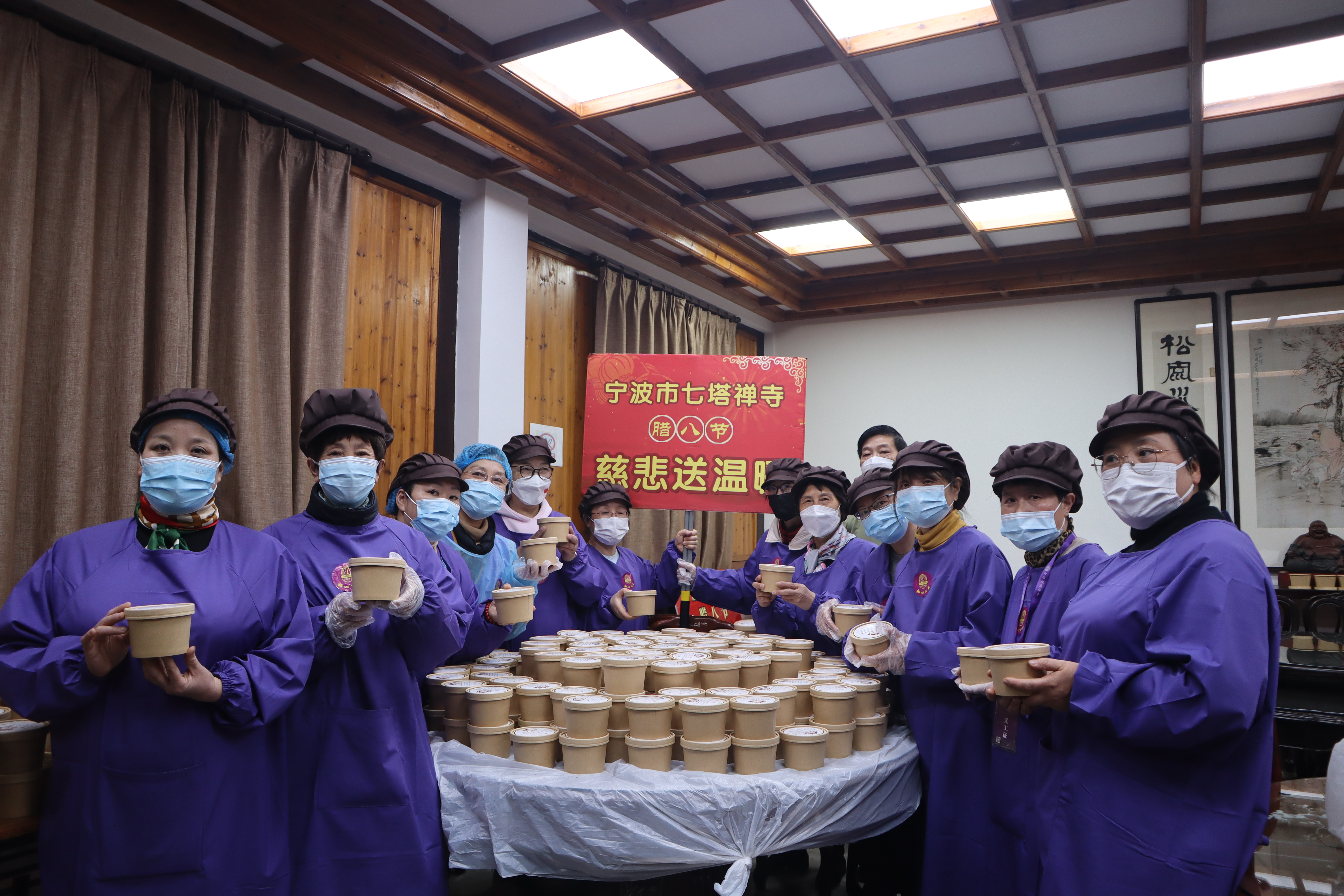 腊八前夕,在义工菩萨们的协助下,七塔禅寺提前备好糯米、红豆、莲子、银耳、核桃、花生等18种食材,熬成美味营养的腊八粥,向区敬老院、福利院、阳光驿站、环卫工人及七塔社区老人奉送,为他们送去冬日的一份暖意。