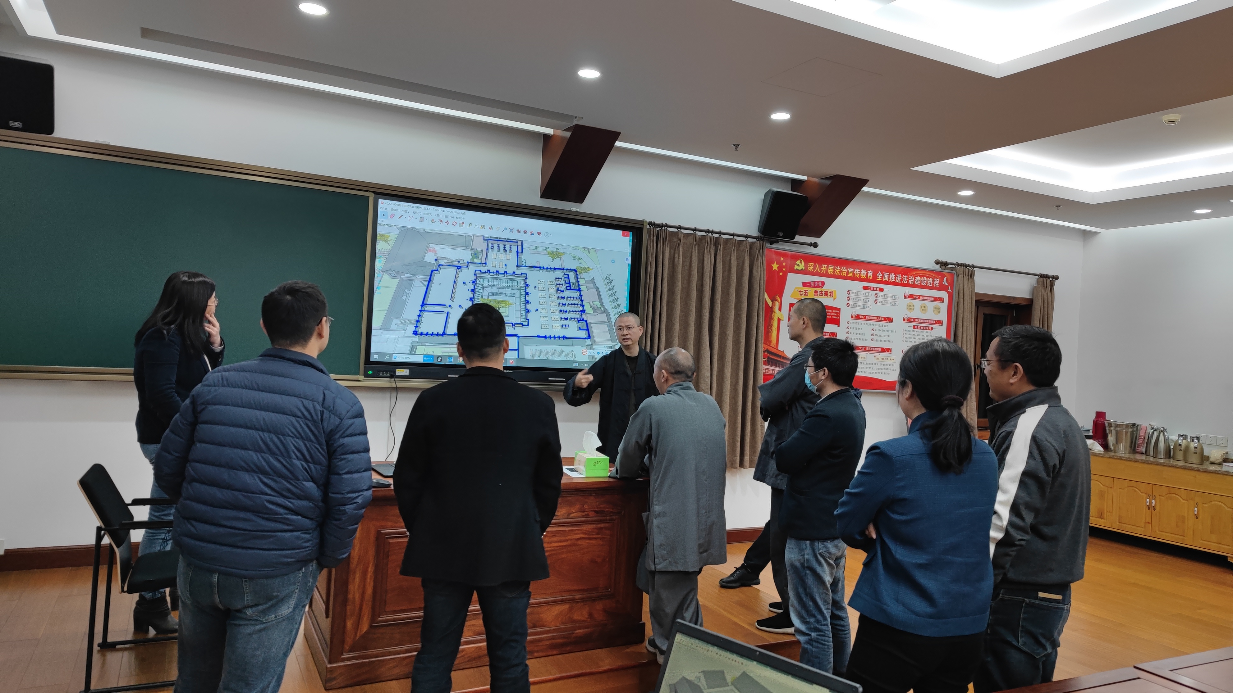 2023年3月28日晚上6点,在七塔禅寺禅学堂二楼教室召开由住持可祥法师组织的关于“两馆三园”设计方案局部变更专题会议。