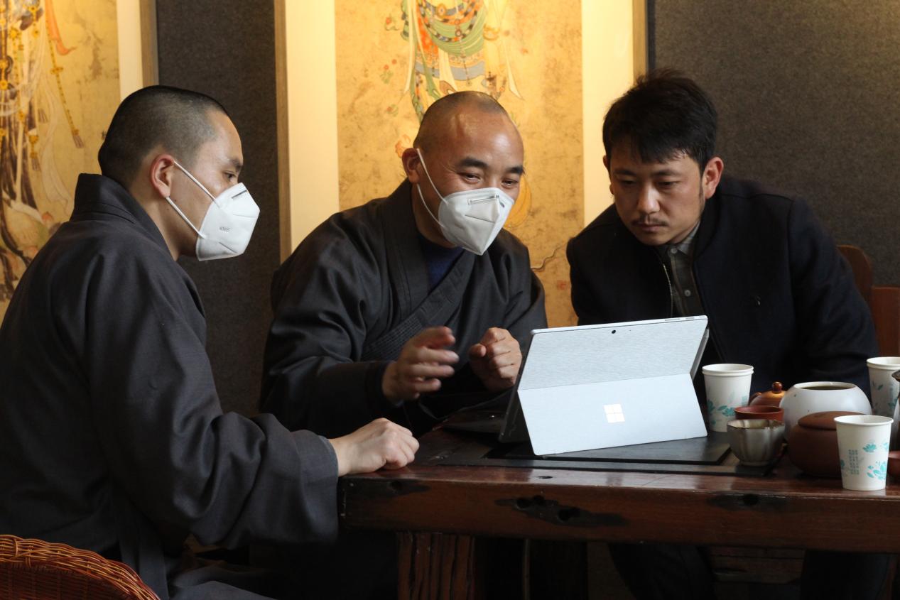 2023年1月6日,为验收七塔禅寺三圣殿《观无量寿经变图》纸本画作并推进三圣殿佛教经变图的绘制进度,监院界义法师带队前往甘肃敦煌,受到画家张杰龙的热情接待。