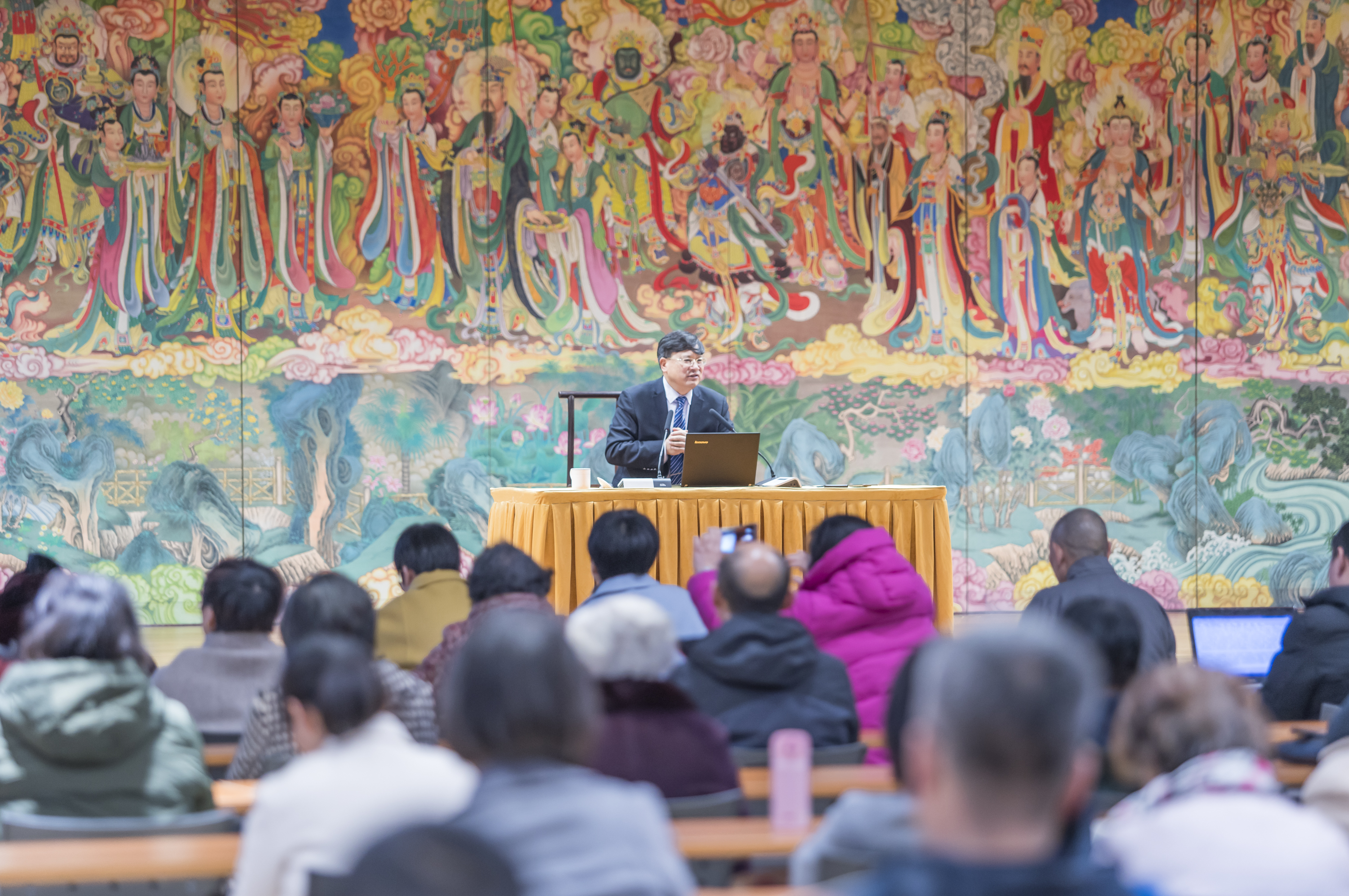 2019 年2月28日下午,南京师范大学美术学院黄征教授应栖心图书馆邀请,在报恩大讲堂为寺院常住、栖心图书馆读者、甬城书法爱好者作了题为《敦煌书法的材料与种类》的讲座。讲座由监院法净法师主持。